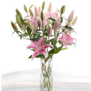H款:6支粉色香水百合,透明圓形花瓶。