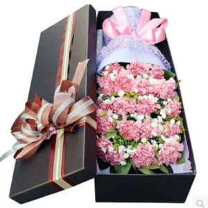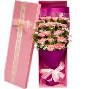 K款:19支粉色康乃馨,黃英、滿天星搭配。長形禮盒包裝。
