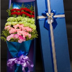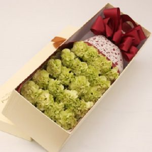 S款:29支綠色康乃馨,紅色蝴蝶結(jié)束扎。長形禮盒包裝。