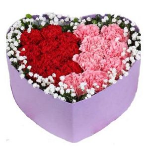 B款:19支紅色康乃馨,9支粉色康乃馨,滿天星、綠葉外圍,粉色心形禮盒包裝。