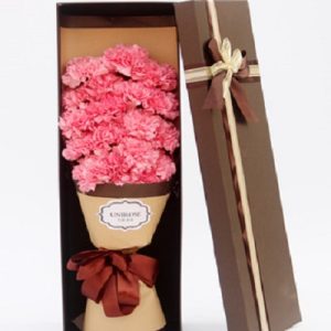 N款:29支粉色康乃馨,牛皮紙包扎,咖啡色蝴蝶結(jié)。長形禮盒包裝。