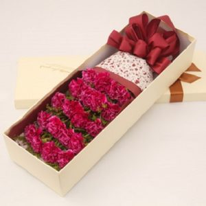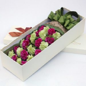 R款:26支綠色加桃紅色康乃馨,綠葉適量搭配。長形禮盒包裝。