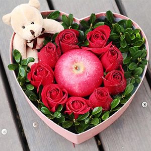 A款玫瑰花心形禮盒:9朵紅玫瑰花加1個蘋果加1個小熊。