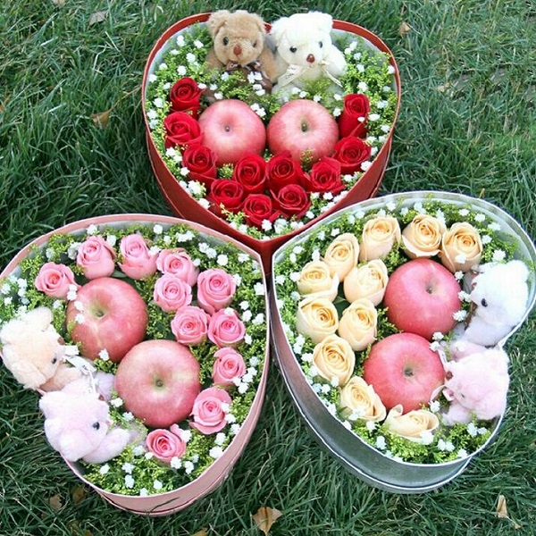 B款玫瑰花心形禮盒:11朵玫瑰花加2個蘋果加2個小熊。(顏色留言)
