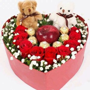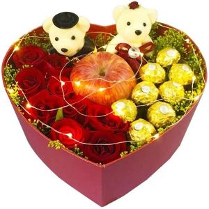 F款玫瑰花心形禮盒:9朵玫瑰加6個巧克力加1個蘋果加2個小熊。
