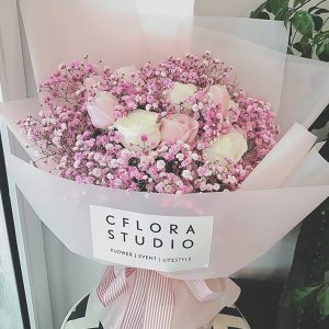 A款玫瑰花:9支玫瑰花(粉玫瑰+白玫瑰+滿天星)花束。