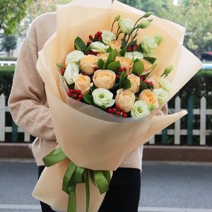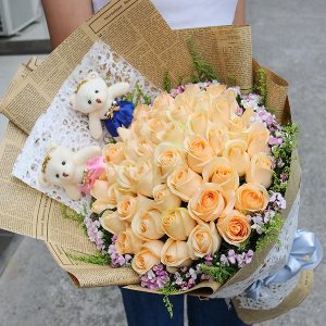 Q款玫瑰花:29支香檳玫瑰加桔梗花束。