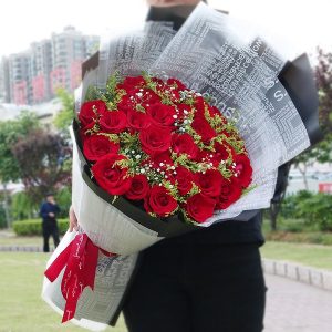 K款玫瑰花:21支紅玫瑰加滿天星、黃英花束。