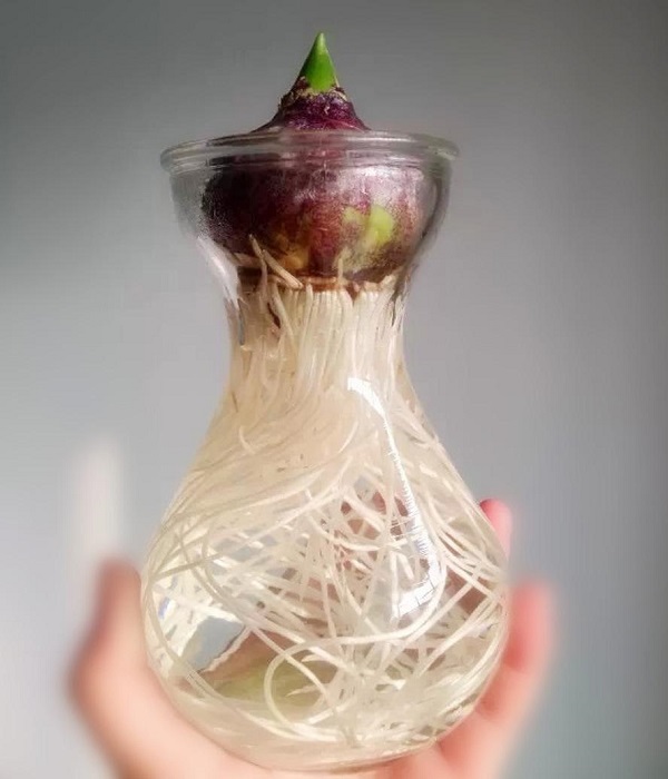 c.把球根放瓶頸上,待發(fā)根后,可將水位降低至根部剛能觸及水面,這樣可使根部充分吸收氧氣,促進(jìn)根須的生長(zhǎng)。當(dāng)根部發(fā)育后,黑布將培養(yǎng)容器遮住,讓球根進(jìn)一步發(fā)育。
