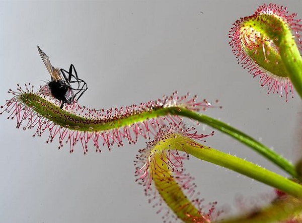 由于茅膏菜葉片上的這種腺毛,能夠代謝黏液,看上去就好像擺滿了小露珠相同,潔白無(wú)瑕。這種黏液能夠像粘紙相同將蟲(chóng)類(lèi)黏住,隨后消化。