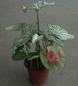 花葉芋的葉子非常的翠綠,在葉子中間會有紅色的葉子相間,明亮的綠色上有白色的斑點。色澤鮮艷的芋頭、白葉綠脈、紅葉、白脈搭配,給人以更美、高貴、典雅的感覺。彩葉芋頭經常被用作室內盆栽植物,通常放在桌子或窗臺上,更優雅典雅。尤其是在落地窗的窗臺上會有更多的風景或者在庭院種植,都可以切花做花材和其他花卉搭配成花束。