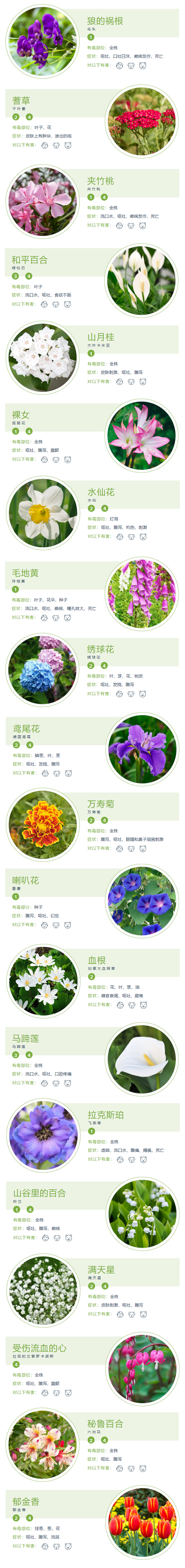 并非所有的花都同樣有毒。以下數(shù)字用于根據(jù)哪些部分有毒以及癥狀的嚴(yán)重程度來組織鮮花。
