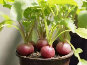 盆栽蔬菜蘿卜 – 種植完美蘿卜的訣竅在于土壤中。按照字面。保持土壤的水分含量接近擰干的海綿。不要像在商店里那樣局限于種植常見的品種。嘗試日本箕瀨或冰雹白蘿卜等品種!