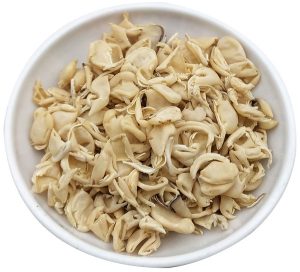扁豆衣呈囊殼狀、凹陷或卷縮成不規則瓢片狀,長約1cm,厚不超過1mm,表面光滑,乳白色或淡黃白色,有的可見種阜,完整的種阜半月形,類白色。質硬韌,體輕。氣微,味淡。以囊殼完整、色黃白、不帶種仁者為佳。